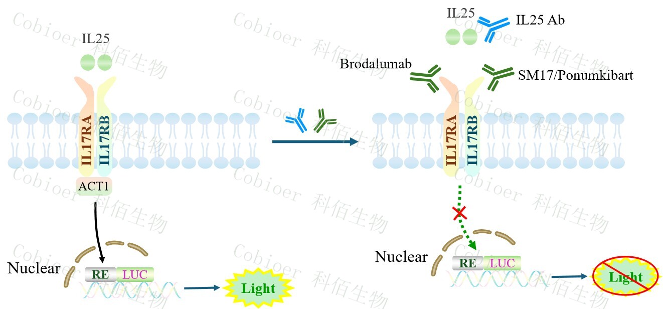 IL25 Effector Reporter Cell(Suspension)報告基因藥靶模型很好的模擬了體內 IL25 的信號轉導過程,原理見下圖所示。![]() Figure 1. IL25 Effector Reporter Cell(Suspension)細胞模型原理圖 |