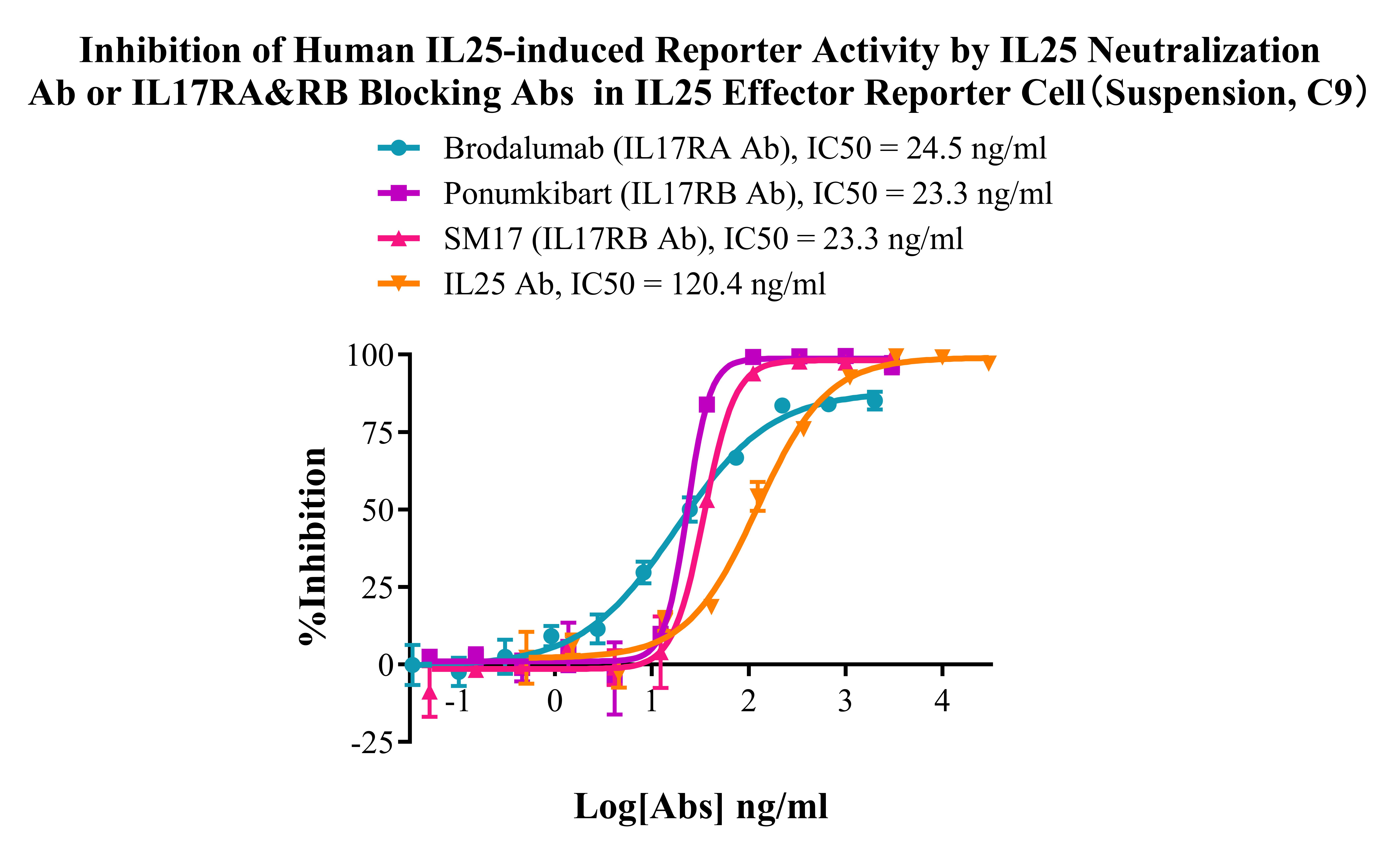 ![]() Figure 4. Inhibition of Human IL25-induced Reporter Activity by IL25 Neutralization Ab or IL17RA&RB Blocking Abs in IL25 Effector Reporter Cell (Suspension, C9). |