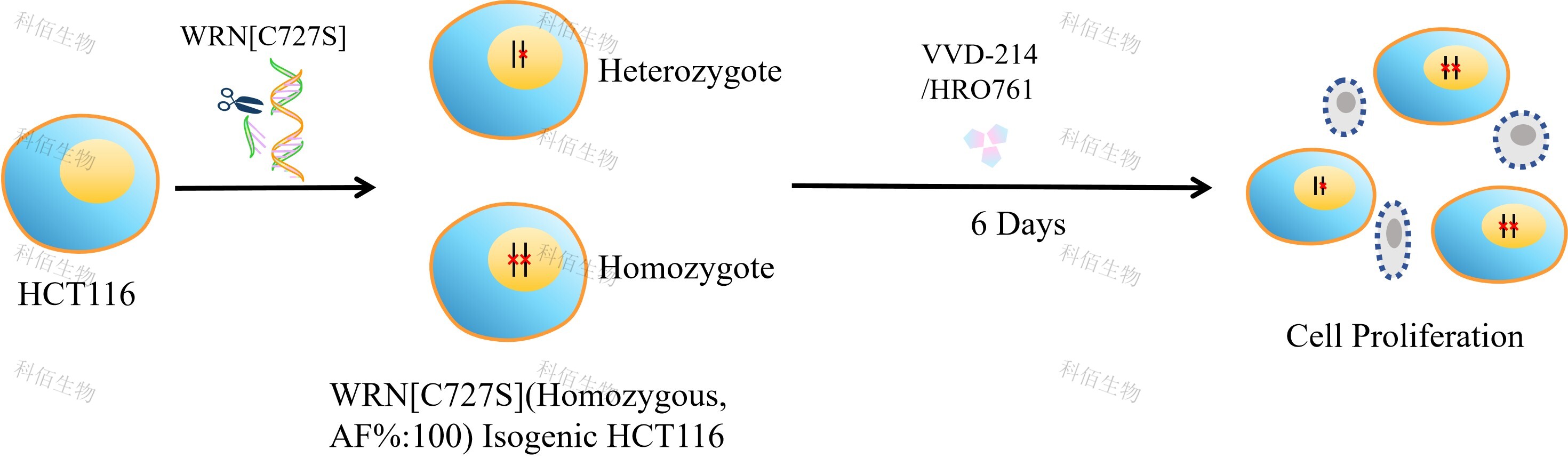 WRN[C727S](Homozygous,AF%:100) Isogenic HCT116 藥靶細胞,通過基因編輯的方式將 WRN 的 727 位氨基酸胱氨酸(C)突變?yōu)榻z氨酸(S)。![]() Figure 1. WRN[C727S](Homozygous,AF%:100) Isogenic HCT116 原理示意圖 |