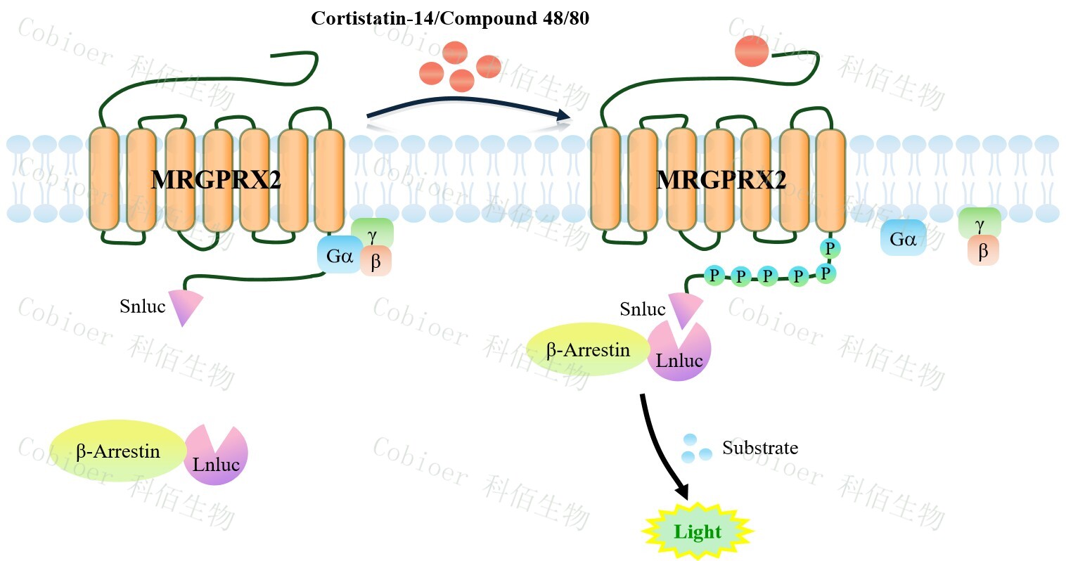 MRGPRX2 β-Arrestin CHO 報告基因藥靶模型很好的模擬了體內(nèi) MRGPRX2/β-Arrestin 的信號轉(zhuǎn)導過程,原理見下圖所示。當缺乏配體刺激時,β-Arrestin 不與 MRGPRX2 結(jié)合, 融合β-Arrestin 的熒光素酶處于失活構(gòu)象;當 MRGPRX2 遭遇配體刺激時,融合熒光素酶報 告基因的β-Arrestin 被招募,使熒光素酶報告基因處于激活狀態(tài),加入其底物后發(fā)光信號增 強。![]() Figure 1. MRGPRX2 β-Arrestin CHO 細胞模型原理圖 |