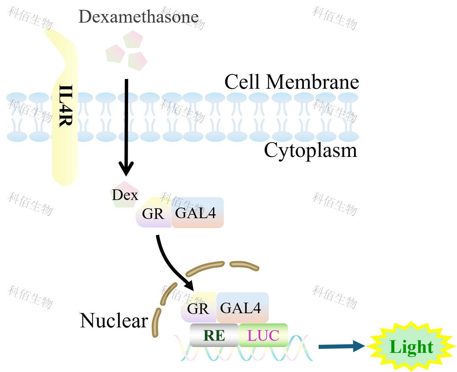 IL4R(High expression)&GR-GAL4 Luciferase Reporter HEK293 報告基因細胞,是在 GR-GAL4 Luciferase Reporter HEK293 重組細胞上過表達人的 IL4R。Dexamethasone (Hexadecadrol,地塞米松)是糖皮質(zhì)激素受體 (Glucocorticoid Receptor)激動劑、凋亡誘導劑,原理見下圖所示。![]() Figure 1. IL4R(High expression)&GR-GAL4 Luciferase Reporter HEK293 細胞原理示意圖 |