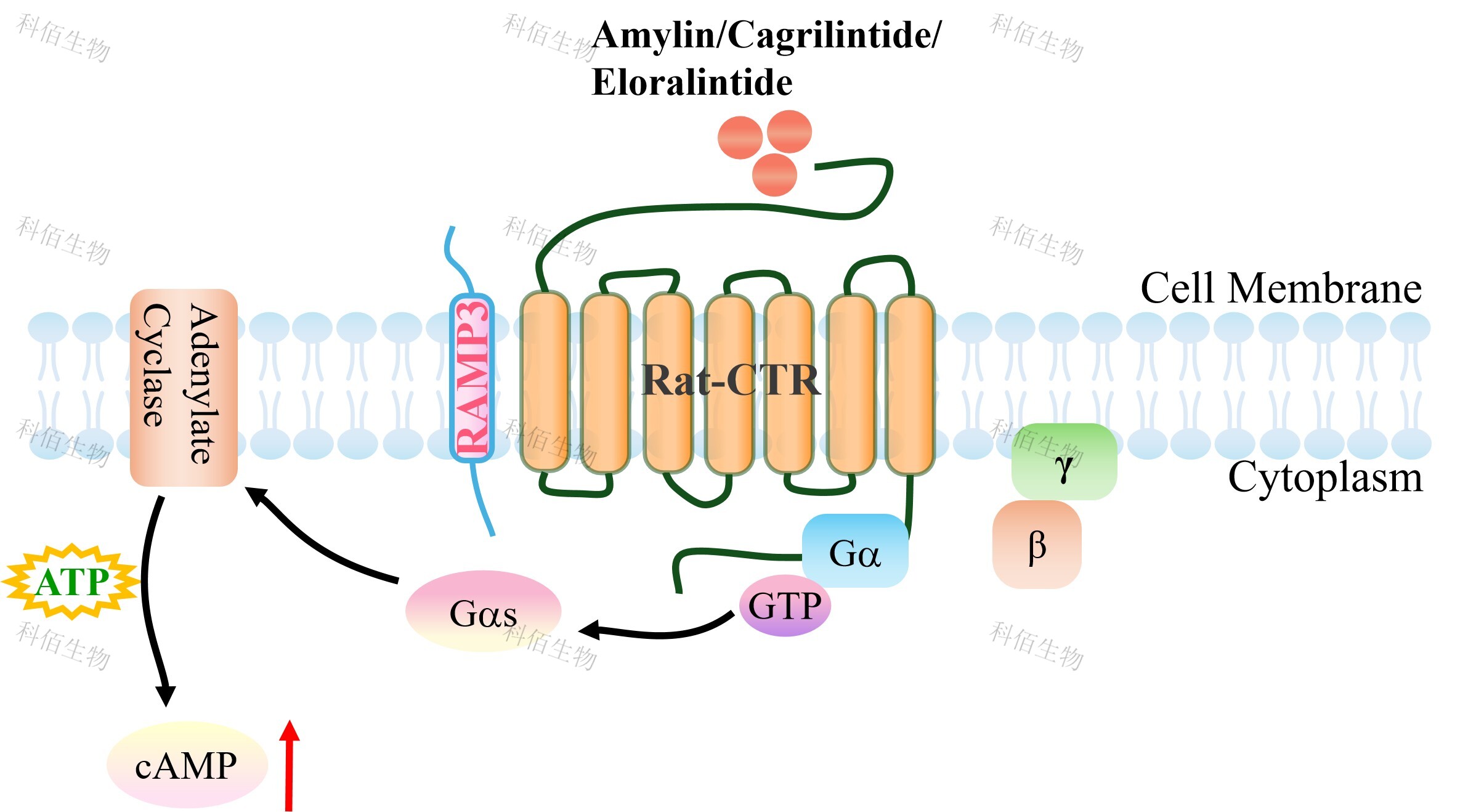 | 降鈣素基因相關(guān)肽(CGRP)家族包括 CGRP 本身、降鈣素(CT)、腎上腺髓質(zhì)素 (AM)和胰島淀粉樣肽(AMY)。 胰淀素(Amylin)受體的三種類型的已被確定,即 AMY1,AMY2 和 AMY3。 胰淀素受體屬于 B 類 GPCR,是異二聚體復(fù)合物,由降鈣素受體(CTR)與受體活性修飾蛋白 (RAMPs)結(jié)合形成。該受體的 CTR 組分具有相同的 GPCR 結(jié)構(gòu):7 個(gè)跨膜相互連接的α- 螺旋,將細(xì)胞外信號(hào)傳遞到細(xì)胞內(nèi)細(xì)胞質(zhì)信號(hào)級(jí)聯(lián)。RAMP 有三種類型(RAMP1、 RAMP2 和 RAMP3),它們共享 31%的氨基酸序列,具有相似的基本結(jié)構(gòu)。RAMP 是將 CTR 轉(zhuǎn)運(yùn)到細(xì)胞膜并調(diào)節(jié)其配體特異性的重要肽,它可以改變特定 GPCR 的藥理學(xué)、功能和細(xì)胞運(yùn)輸。 哺乳動(dòng)物細(xì)胞中 Amylin 受體的激活已被證明可以提高 cAMP,并被認(rèn)為與 Gs 蛋白和腺苷酸環(huán)化酶的刺激有關(guān)。在 RAMPs 的存在下,其與胰淀素的結(jié)合親和力可以被修飾。 CTR 和 RAMP1 或 CTR 和 RAMP3 的異質(zhì)結(jié)構(gòu)被認(rèn)為有利于與胰淀素結(jié)合,介導(dǎo)大腦中的生理功能。AMY3 的激活刺激 G 蛋白 Gαs,進(jìn)一步控制腺苷酸環(huán)化酶(AC),隨后增加細(xì) 胞 cAMP。cAMP 與 PKA 調(diào)控亞基(R2)的結(jié)合誘導(dǎo) PKA 四聚體全酶解離,導(dǎo)致 PKA 催化亞基的激活。cAMP 激活的 PKA 參與調(diào)控 ERK1/2 的活性。ERK1/2 通路的觸發(fā)可能導(dǎo)致 Ca 2+分布不均勻,引發(fā)內(nèi)質(zhì)網(wǎng)和線粒體功能障礙,導(dǎo)致細(xì)胞死亡。此外,cAMP 刺激 AKT 進(jìn)一步導(dǎo)致轉(zhuǎn)錄因子 cFos 的表達(dá)。 |