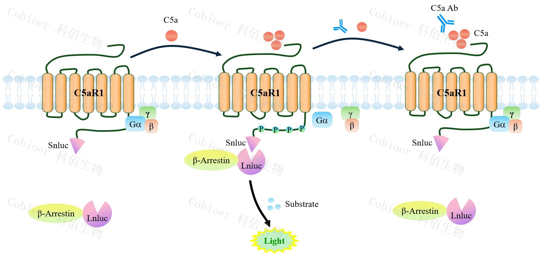 C5aR1 β-Arrestin CHO 報(bào)告基因藥靶模型很好的模擬了體內(nèi) C5aR1/β-Arrestin 的信號(hào)轉(zhuǎn)導(dǎo)過程,原理見下圖所示。![]() Figure 1. C5aR1 β-Arrestin CHO 細(xì)胞模型原理圖 |