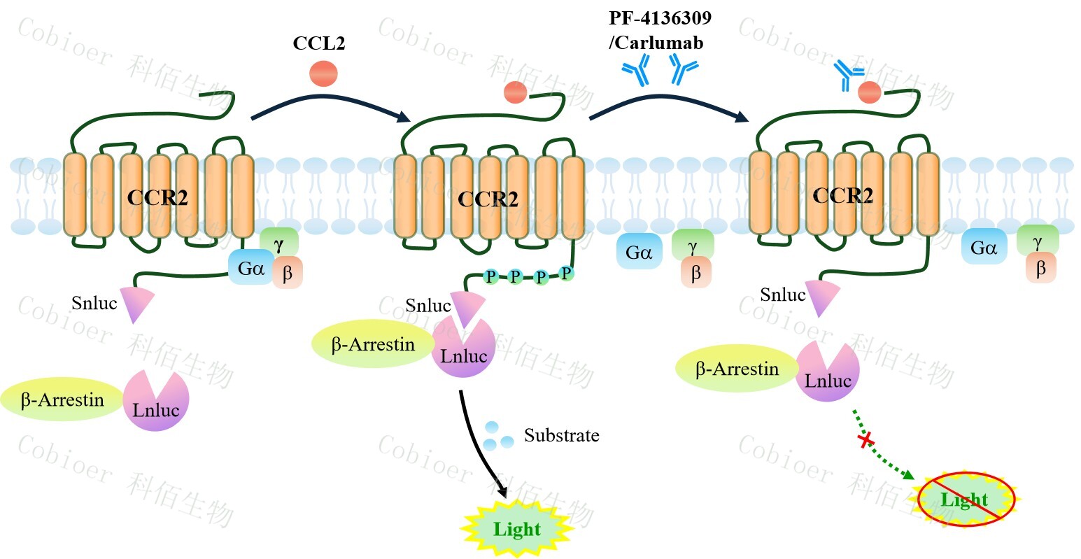 CCR2 β-Arrestin CHO 報(bào)告基因藥靶模型很好的模擬了體內(nèi) CCR2/β-Arrestin 的信號(hào)轉(zhuǎn) 導(dǎo)過程,原理見下圖所示。當(dāng)缺乏配體刺激時(shí),β-Arrestin 不與 CCR2 結(jié)合,融合β-Arrestin 的熒光素酶處于失活構(gòu)象,當(dāng) CCR2 遭遇配體刺激時(shí),融合熒光素酶報(bào)告基因的β-Arrestin 被招募,使熒光素酶報(bào)告基因處于激活狀態(tài),加入其底物后發(fā)光信號(hào)增強(qiáng)。![]() Figure 1. CCR2 β-Arrestin CHO 細(xì)胞模型原理圖 |