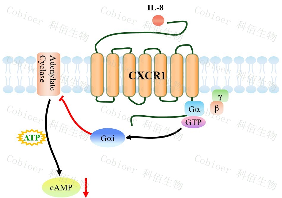 cAMP 在 G 蛋白偶聯(lián)受體(GPCR)信號轉(zhuǎn)導(dǎo)中是一種關(guān)鍵的第二信使。當(dāng)配體結(jié)合 到 GPCR,構(gòu)象發(fā)生變化,激活受體接著激活 G 蛋白,Gi 的激活導(dǎo)致腺苷酸環(huán)化酶調(diào)控 cAMP 的下調(diào)。CXCR1 CHO 藥靶模型很好的模擬了體內(nèi) CXCR1 的信號轉(zhuǎn)導(dǎo)過程,原理見下圖所示。![]() Figure 1. CXCR1 CHO 細(xì)胞模型原理圖 |