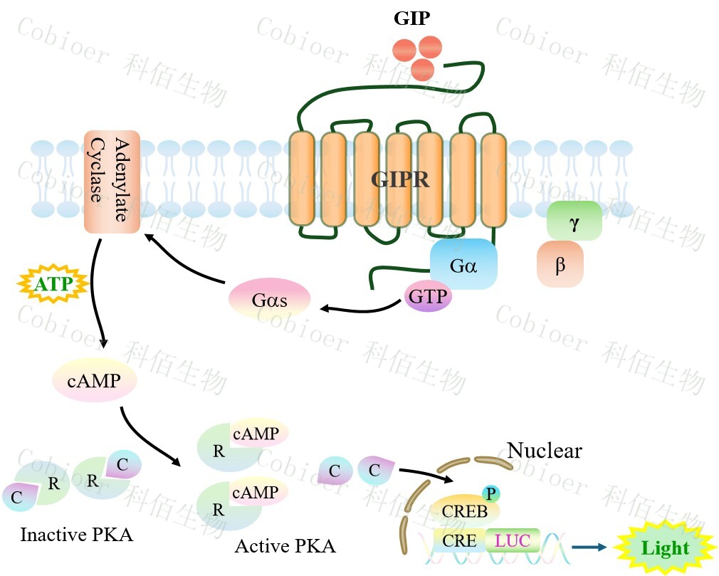 GIPR CRE-Luc HEK293 報告基因藥靶模型很好的模擬了體內(nèi) GIPR 的信號轉(zhuǎn)導(dǎo)過程, 原理見下圖所示。