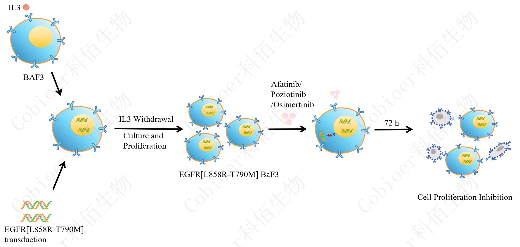 BaF3(小鼠原 B 細(xì)胞)的生長和增殖需要 IL-3 的維持。通過引入各種表達(dá)激酶的基因, 能作為 BaF3 的驅(qū)動(dòng)基因,讓 BaF3 不再依賴 IL-3 而增殖,進(jìn)而激酶基因成為 BaF3 增殖依 賴的驅(qū)動(dòng)基因,用于評(píng)估小分子藥物對(duì)激酶的靶向抑制作用,原理及流程見下圖所示。