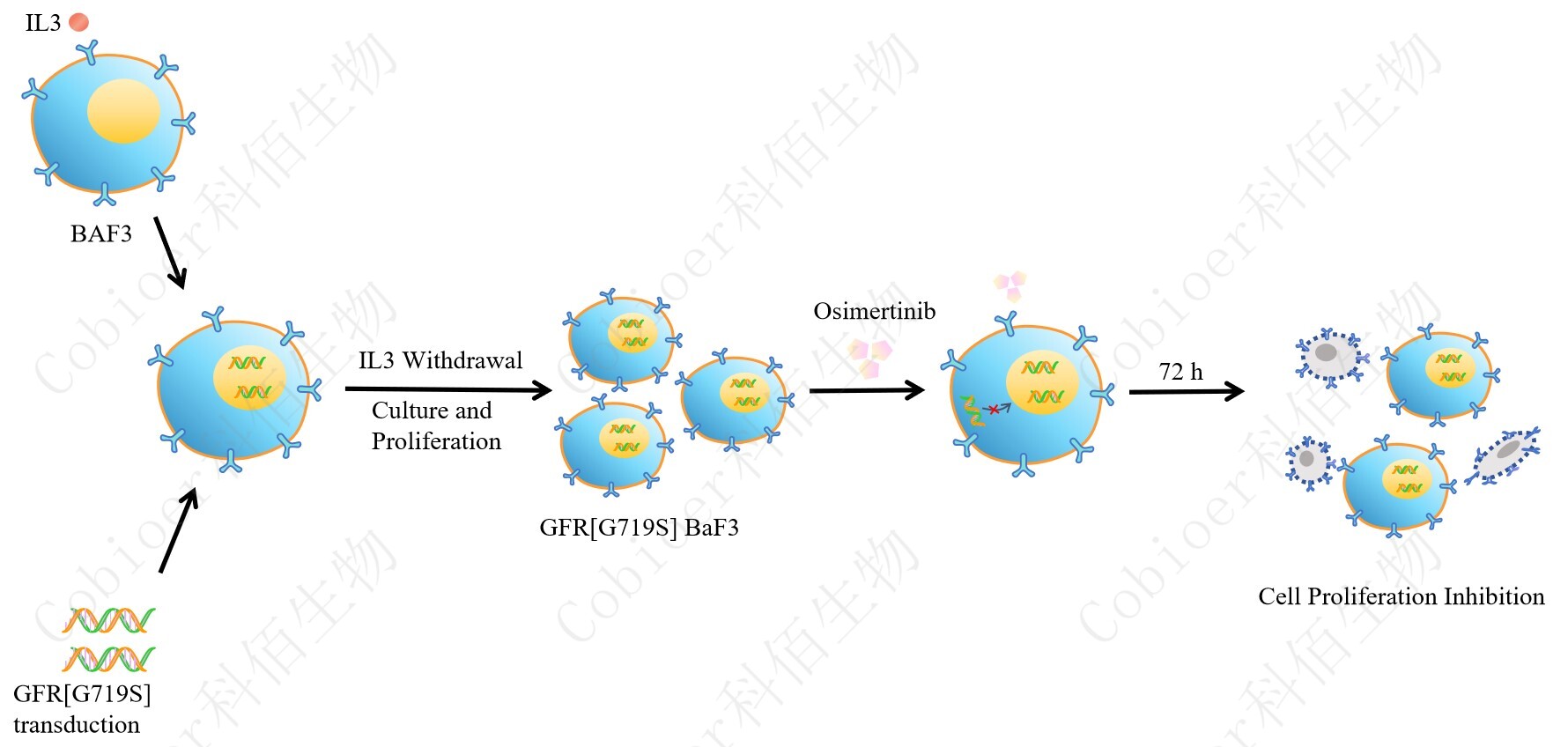 BaF3(小鼠原 B 細胞)的生長和增殖需要 IL-3 的維持。通過引入各種表達激酶的基因, 能作為 BaF3 的驅動基因,讓 BaF3 不再依賴 IL-3 而增殖,進而激酶基因成為 BaF3 增殖依 賴的驅動基因,用于評估小分子藥物對激酶的靶向抑制作用,原理及流程見下圖所示。