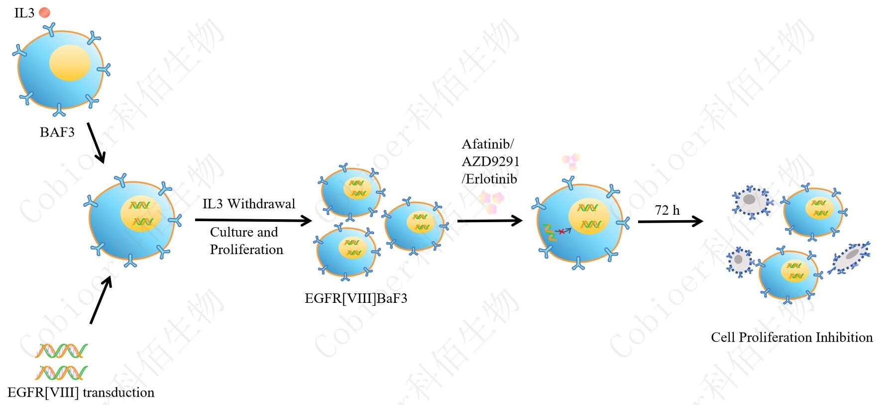 BaF3(小鼠原 B 細(xì)胞)的生長和增殖需要 IL-3 的維持。通過引入各種表達(dá)激酶的基因, 能作為 BaF3 的驅(qū)動(dòng)基因,讓 BaF3 不再依賴 IL-3 而增殖,進(jìn)而激酶基因成為 BaF3 增殖依 賴的驅(qū)動(dòng)基因,用于評(píng)估小分子藥物對(duì)激酶的靶向抑制作用,原理及流程見下圖所示。