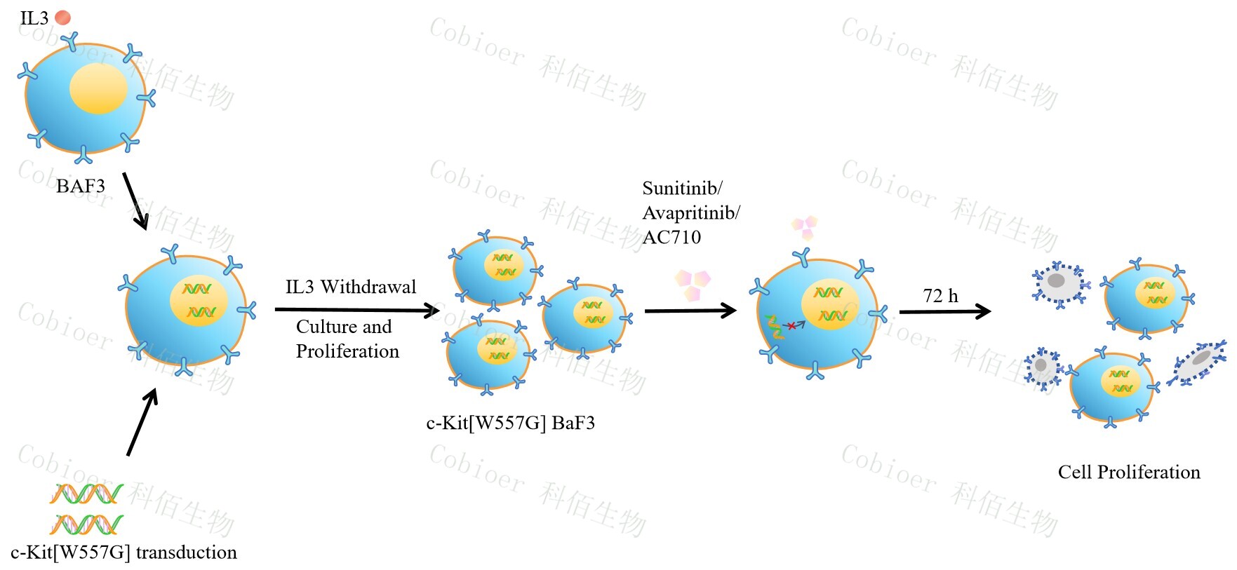 | c-Kit[W557G] BaF3 藥靶細(xì)胞,通過(guò)轉(zhuǎn)導(dǎo)突變狀態(tài)的 c-Kit[W557G] 基因 到 BaF3 細(xì)胞系中,穩(wěn)定表達(dá)人突變形態(tài)下的 c-Kit[W557G] 基因。 BaF3(小鼠原 B 細(xì)胞)的生長(zhǎng)和增殖需要 IL-3 的維持。通過(guò)引入各種表達(dá)激酶的基因, 能作為 BaF3 的驅(qū)動(dòng)基因,讓 BaF3 不再依賴 IL-3 而增殖,進(jìn)而激酶基因成為 BaF3 增殖依 賴的驅(qū)動(dòng)基因,用于評(píng)估小分子藥物對(duì)激酶的靶向抑制作用,原理及流程見(jiàn)下圖所示。 ![]() Figure 1. c-Kit[W557G] BaF3 細(xì)胞的構(gòu)建原理圖 |