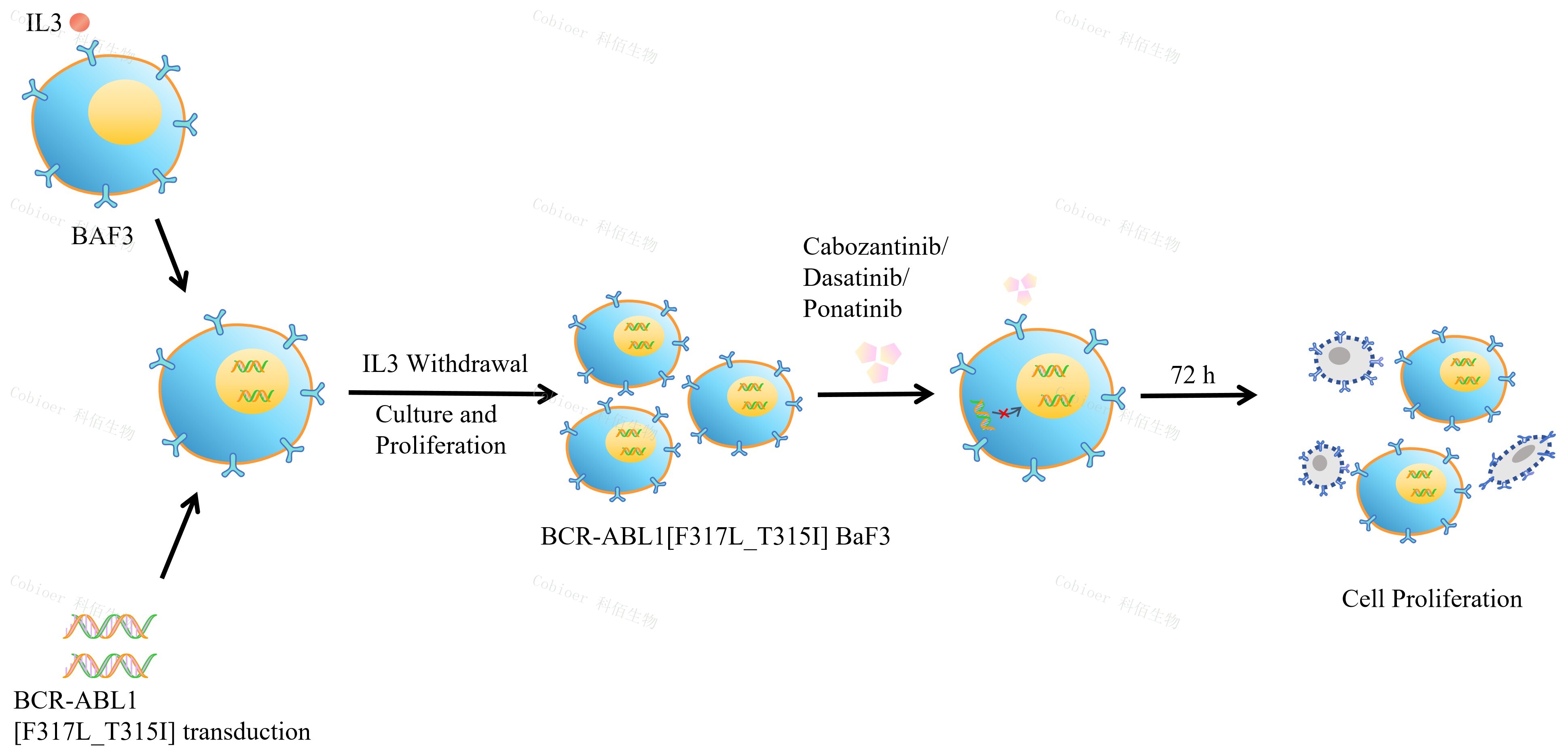 | BCR-ABL1[F317L_T315I] BaF3 藥靶細胞,通過轉(zhuǎn)導(dǎo)突變狀態(tài)的 BCR- ABL1[F317L_T315I] 基因到 BaF3 細胞系中 , 穩(wěn)定表達人突變形態(tài)下的 BCR- ABL1[F317L_T315I]基因。 BaF3(小鼠原 B 細胞)的生長和增殖需要 IL-3 的維持。通過引入各種表達激酶的基因, 能作為 BaF3 的驅(qū)動基因,讓 BaF3 不再依賴 IL-3 而增殖,進而激酶基因成為 BaF3 增殖依賴的驅(qū)動基因,用于評估小分子藥物對激酶的靶向抑制作用,原理及流程見圖 1 所示。 ![]() Figure 1. BCR-ABL1[F317L_T315I] BaF3 細胞的構(gòu)建原理圖 |