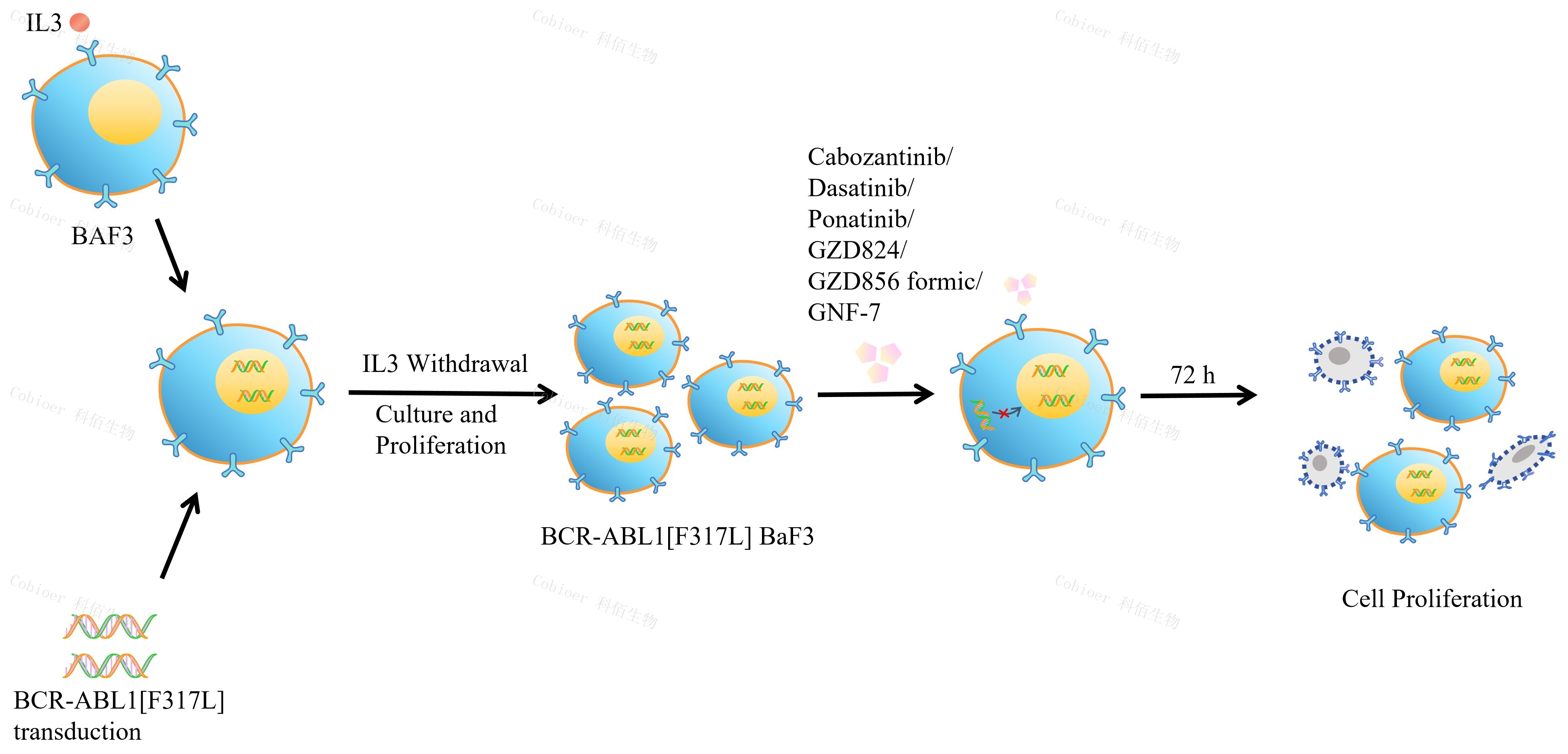 | BCR-ABL1[F317L] BaF3 藥靶細(xì)胞 , 通過轉(zhuǎn)導(dǎo)突變狀態(tài)的 BCR- ABL1[F317L]基因到 BaF3 細(xì)胞系中,穩(wěn)定表達人突變形態(tài)下的 BCR-ABL1[F317L]基因。 BaF3(小鼠原 B 細(xì)胞)的生長和增殖需要 IL-3 的維持。通過引入各種表達激酶的基因, 能作為 BaF3 的驅(qū)動基因,讓 BaF3 不再依賴 IL-3 而增殖,進而激酶基因成為 BaF3 增殖依賴的驅(qū)動基因,用于評估小分子藥物對激酶的靶向抑制作用,原理及流程見下圖所示。 ![]() Figure 1. BCR-ABL1[F317L] BaF3 細(xì)胞的構(gòu)建原理圖 |