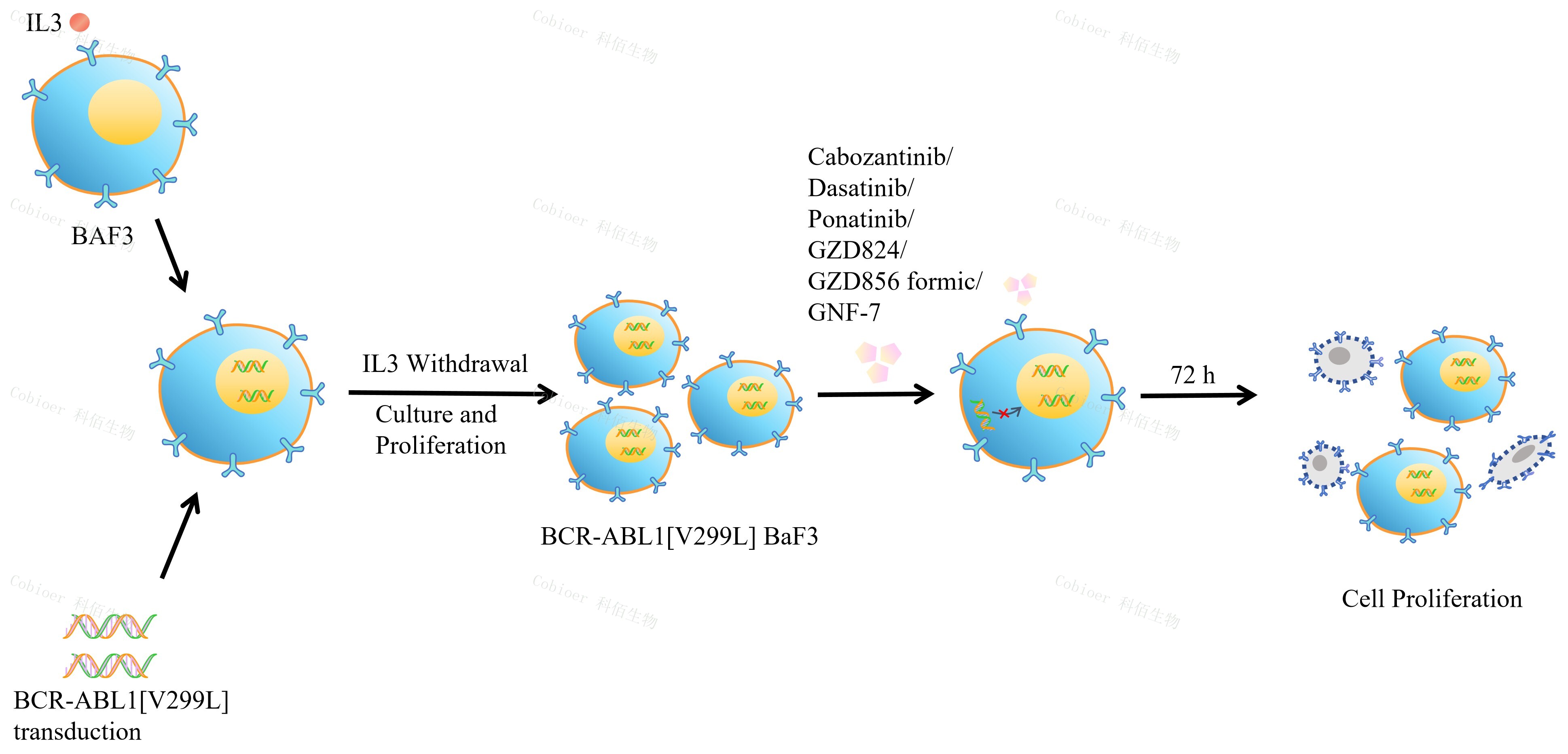 | BCR-ABL1[V299L] BaF3 藥靶細(xì)胞 , 通過轉(zhuǎn)導(dǎo)突變狀態(tài)的 BCR- ABL1[V299L]基因到 BaF3 細(xì)胞系中,穩(wěn)定表達(dá)人突變形態(tài)下的 BCR-ABL1[V299L]基因。 BaF3(小鼠原 B 細(xì)胞)的生長和增殖需要 IL-3 的維持。通過引入各種表達(dá)激酶的基因, 能作為 BaF3 的驅(qū)動(dòng)基因,讓 BaF3 不再依賴 IL-3 而增殖,進(jìn)而激酶基因成為 BaF3 增殖依賴的驅(qū)動(dòng)基因,用于評估小分子藥物對激酶的靶向抑制作用,原理及流程見下圖所示。 ![]() Figure 1. BCR-ABL1[V299L] BaF3 細(xì)胞的構(gòu)建原理圖 |