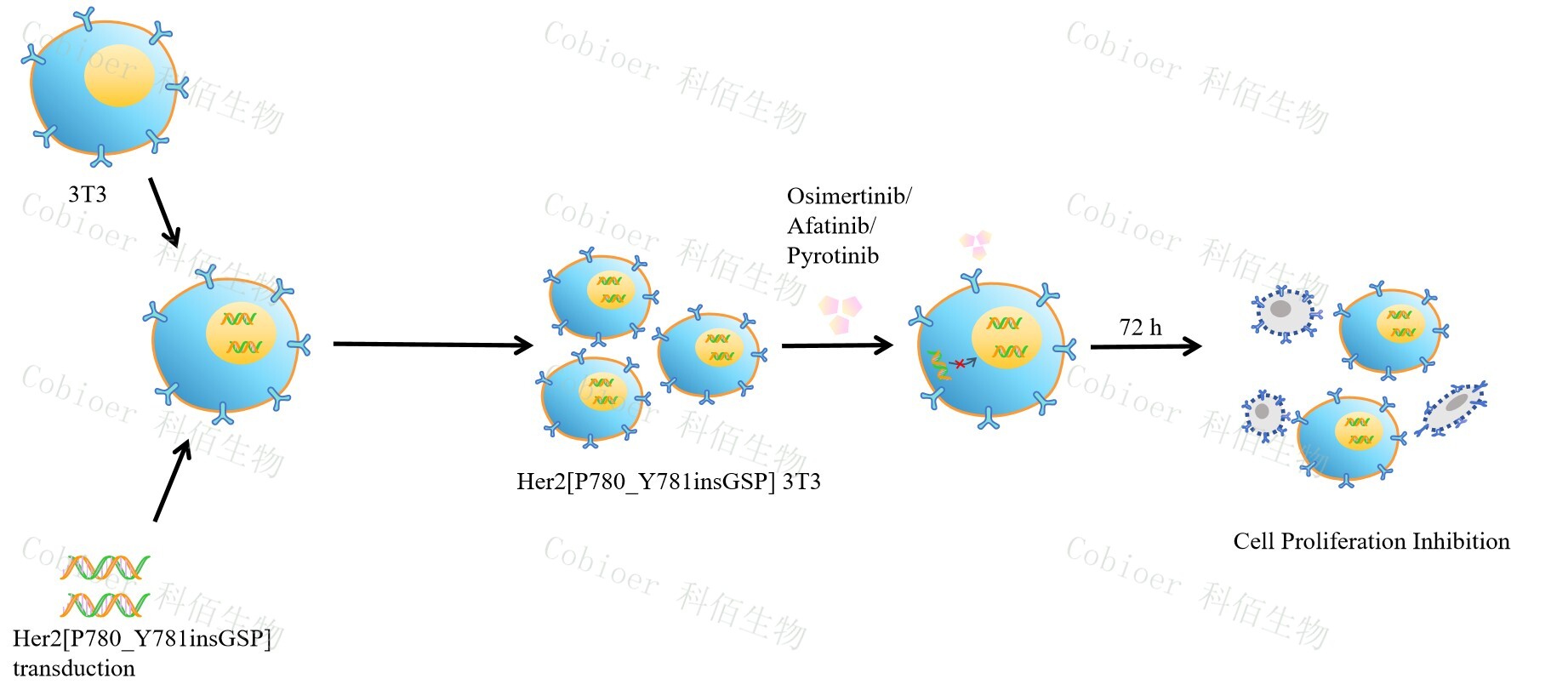 HER2[P780_Y781insGSP] 3T3 藥靶細(xì)胞 , 通過(guò)轉(zhuǎn)導(dǎo)突變狀態(tài)的 HER2[P780_Y781insGSP] 基因到 3T3 細(xì)胞系中 , 穩(wěn)定表達(dá)人突變形態(tài)下的 HER2[P780_Y781insGSP]基因,原理及流程見(jiàn)下圖所示。![]() Figure 1. HER2[P780_Y781insGSP] 3T3 細(xì)胞的構(gòu)建原理圖 |