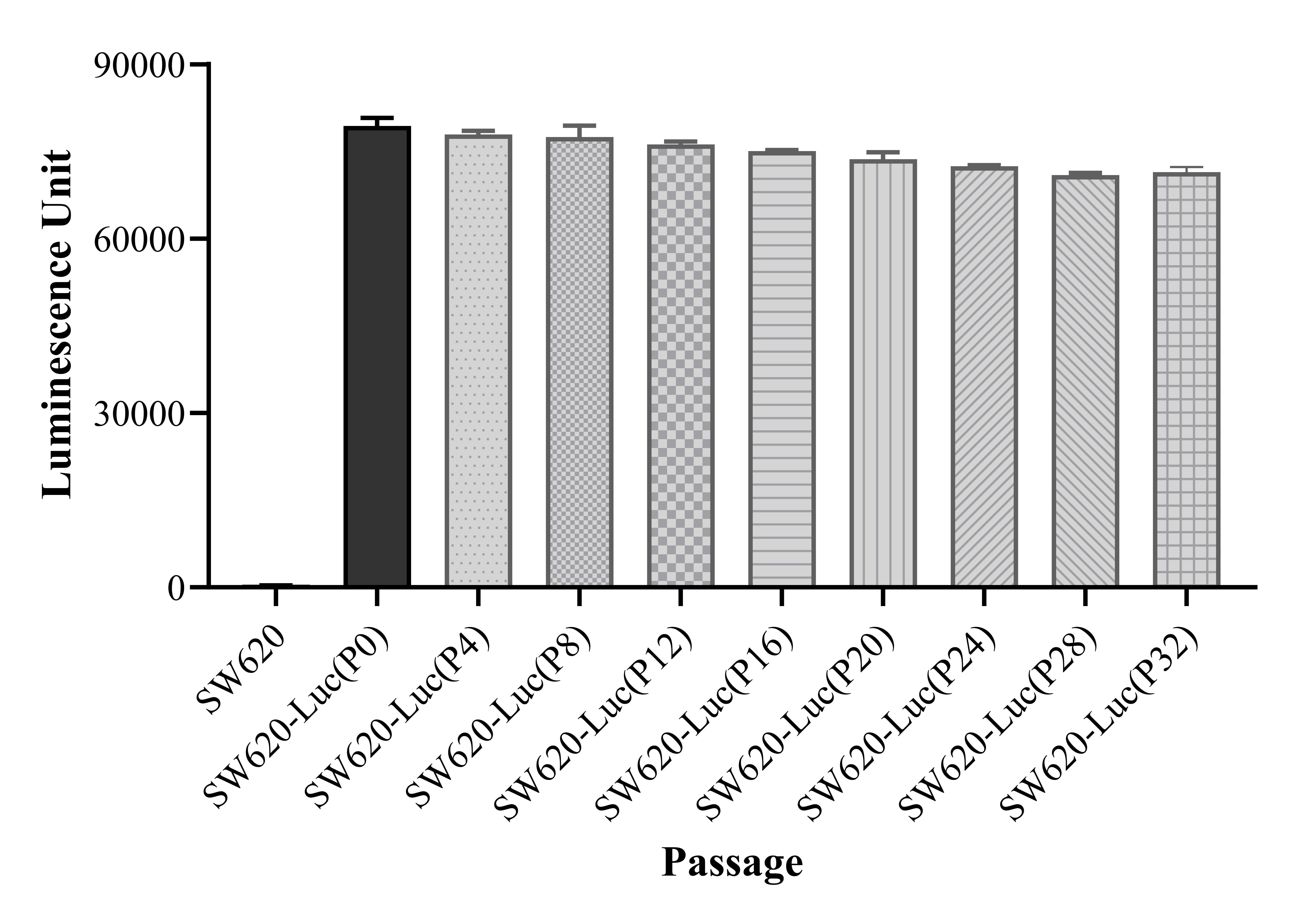 Figure 1. Stablity test results. SW620-Luc cell showed at least 32 passage stability with similar luminescence unit.