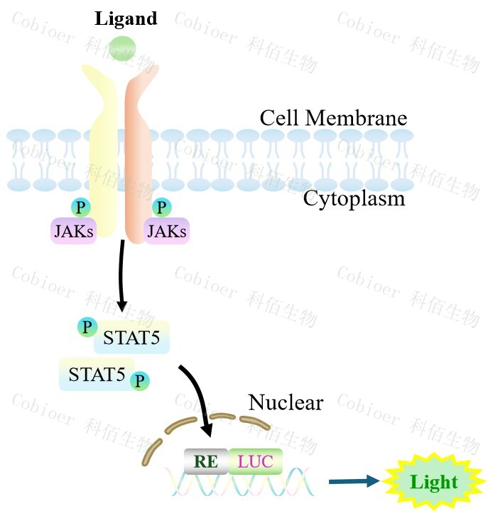 STAT5-Luc TF1 報告基因細(xì)胞,是由 STAT5 調(diào)控并表達(dá) Luc 熒光素酶報 告基因的 TF1 細(xì)胞。GM-CSF 與受體結(jié)合,激活 STAT5 的原理見下圖所示。![]() Figure 1. STAT5-Luc TF1 細(xì)胞模型原理圖 |