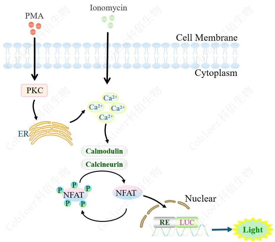 NFAT-Luc HEK293 報告基因藥靶模型很好的模擬了體內(nèi) NFAT 的信號轉(zhuǎn)導(dǎo)過程,原理見下圖所示。 ![]() Figure 1. NFAT-Luc HEK293 細(xì)胞模型原理圖 |