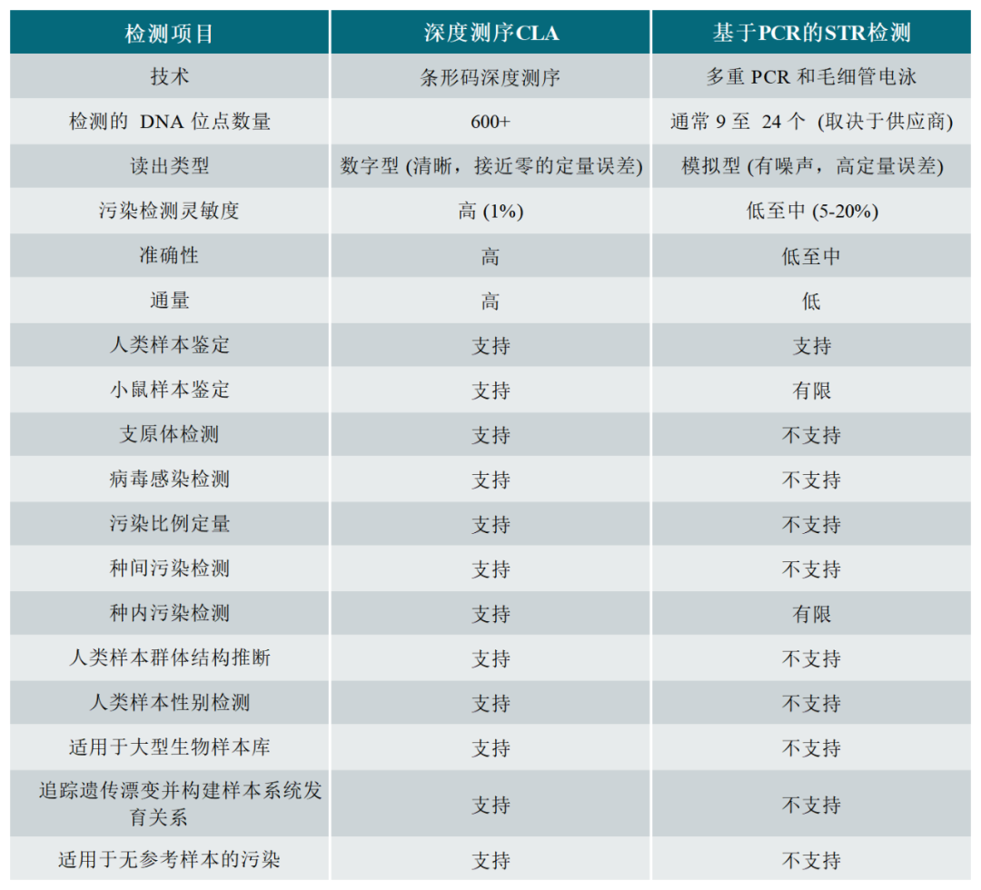 下表比較了用于細(xì)胞系認(rèn)證的深度測(cè)序CLA和基于PCR的STR檢測(cè):