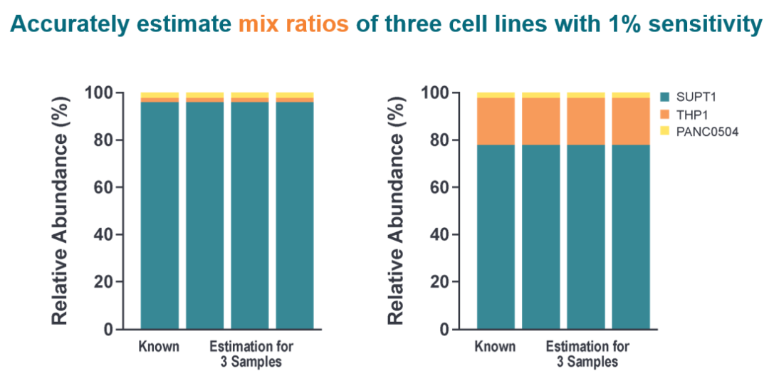 混合細(xì)胞:準(zhǔn)確估算三種細(xì)胞系的混合比例,靈敏度為 1%。
