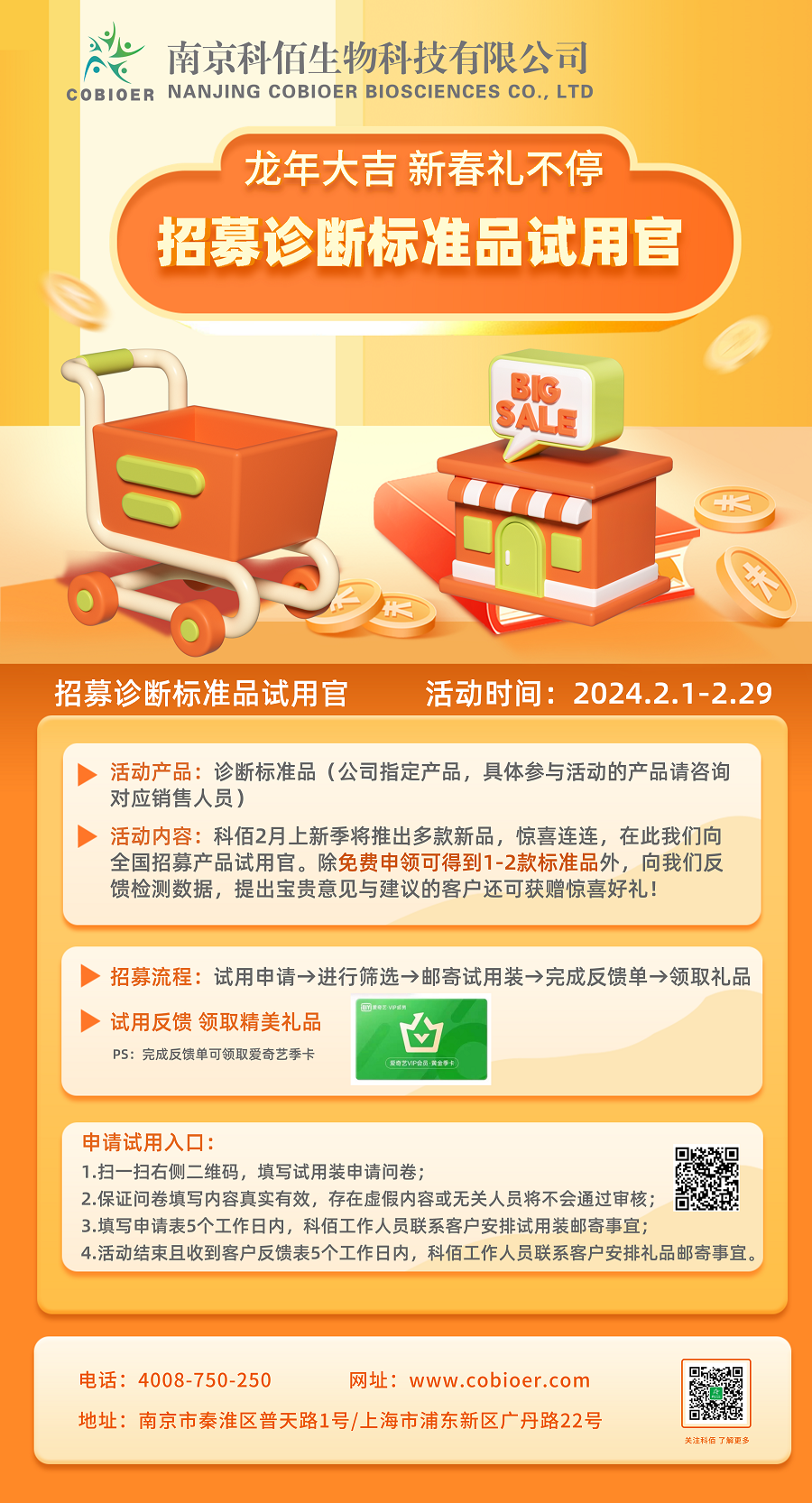 科佰生物2月上新季將推出多款新品,驚喜連連,在此我們向全國(guó)招募產(chǎn)品試用官。除免費(fèi)申領(lǐng)可得到1-2款標(biāo)準(zhǔn)品外,向我們反饋檢測(cè)數(shù)據(jù),提出寶貴意見(jiàn)與建議的客戶還可獲贈(zèng)驚喜好禮!