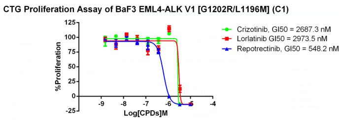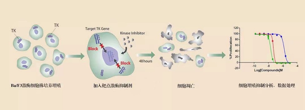 我們結(jié)合自己多年在細(xì)胞領(lǐng)域的豐富經(jīng)驗(yàn),在 Ba/F3(小鼠原B細(xì)胞)上進(jìn)行改造,引入相應(yīng)表達(dá)激酶基因,這些基因能作為Ba/F3的驅(qū)動(dòng)基因,讓Ba/F3不再依賴IL-3而增殖,進(jìn)而激酶基因成為Ba/F3增殖依賴的驅(qū)動(dòng)基因,用于評(píng)估小分子藥物對(duì)激酶的靶向抑制作用。