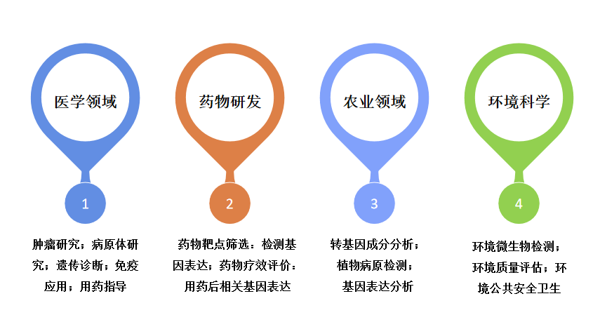 實時熒光定量PCR具有靈敏度高、特異性強、快速高效的特點,廣泛應(yīng)用于生物醫(yī)藥、臨床診斷、農(nóng)業(yè)、環(huán)境科學(xué)等多個領(lǐng)域,常用于檢測基因表達、基因變異、轉(zhuǎn)基因等。