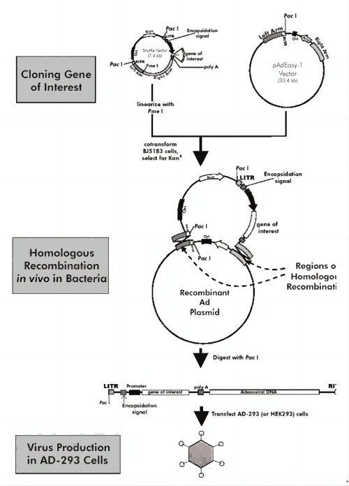AdEasy包裝系統(tǒng)主要的特點(diǎn)是利用Cre/loxP系統(tǒng)在大腸桿菌(BJ5183)中完成外源基因插入腺病毒基因組的過(guò)程,獲得環(huán)狀的重組腺病毒基因組,并且具有在細(xì)菌中復(fù)制的必需元件。將重組腺病毒基因組酶切線性化后轉(zhuǎn)染HEK293細(xì)胞,避免了雙質(zhì)粒共轉(zhuǎn)染得到重組腺病毒。