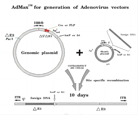AdMax包裝系統(tǒng)是通過(guò)Cre/loxP 獲得重組病毒,這個(gè)過(guò)程發(fā)生在HEK293細(xì)胞中,從而避免在細(xì)菌中重組。將克隆了外源基因的腺病毒穿梭質(zhì)粒與攜帶了腺病毒大部分基因組的包裝質(zhì)粒共轉(zhuǎn)染HEK293細(xì)胞,利用Cre/loxP系統(tǒng)的作用實(shí)現(xiàn)重組,產(chǎn)生重組腺病毒。這個(gè)系統(tǒng)有多種優(yōu)勢(shì),包括操作簡(jiǎn)便、重組效率高、獲得的病毒產(chǎn)率高、目的基因的表達(dá)水平高(因?yàn)閙CMV啟動(dòng)子比hCMV啟動(dòng)子強(qiáng)若干倍)等。