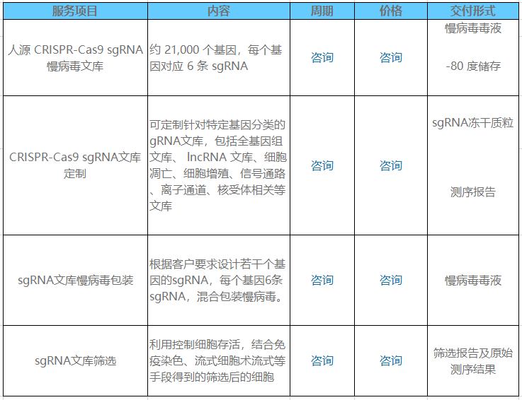 · 為客戶提供從sgRNA文庫設(shè)計(jì)、芯片Oligo引物合成、文庫構(gòu)建及慢病毒包裝到篩選的一站式基因功能篩選服務(wù)。