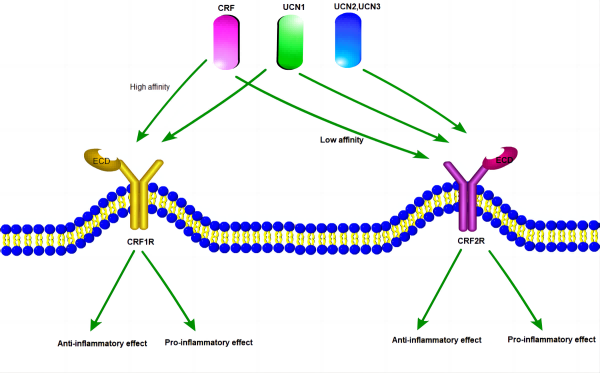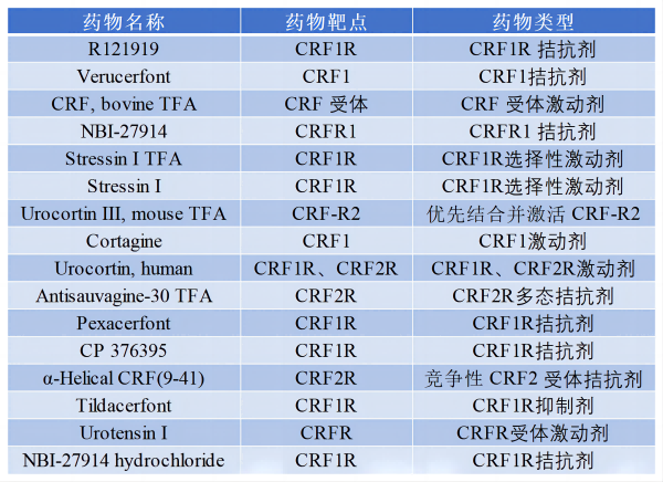 CRF1R和CRF2R主要是通過偶聯(lián)下游Gs蛋白參與體內內分泌系統(tǒng)、行為系統(tǒng)和免疫系統(tǒng)的壓力應答。CRF1R和CRF2R在體內被內源性配體CRF和UCN1-3 激活。與UCN1對CRF1R和CRF2R都有高親和力不同,CRF對CRF1R的親和力明顯高于CRF2R,而UCN2和UCN3則表現出了對CRF2R選擇性激動劑的活性。