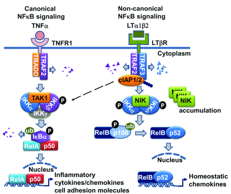 LTBR 信號傳導(dǎo)具有多效性功能,包括控制淋巴器官發(fā)育、由于維持完整的淋巴結(jié)構(gòu)而支持針對病原體的有效免疫反應(yīng)、誘導(dǎo)三級淋巴結(jié)構(gòu)(LTS)、肝臟再生或控制脂質(zhì)穩(wěn)態(tài)。通過LTBR 的信號傳導(dǎo)包括非經(jīng)典/經(jīng)典NF-κB 途徑,從而誘導(dǎo)趨化因子、細(xì)胞因子或粘附分子表達(dá)、細(xì)胞增殖和細(xì)胞存活。LTα1β2與LTβR的結(jié)合啟動TRAF2和TRAF3向LTβR復(fù)合物募集,其中TRAF2和TRAF3被cIAP1/2降解,導(dǎo)致NF-κ b誘導(dǎo)激酶(NIK)的穩(wěn)定和積累。NIK與IKKα復(fù)合物被激活并導(dǎo)致同二聚體IKKα磷酸化。最終,與RelB結(jié)合的p100前體被切割成p52,并導(dǎo)致RelB-p52異二聚體復(fù)合體易位到細(xì)胞核,啟動趨化因子基因轉(zhuǎn)錄。LTβR連接還激活I(lǐng)KKα/β磷酸化和RelA/p50核易位,從而導(dǎo)致炎癥和細(xì)胞粘附分子的基因轉(zhuǎn)錄。