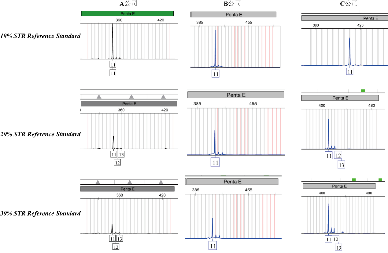 Fig 2. 不同污染占比濃度的STR樣本在三家公司Penta E基因座的STR檢測結(jié)果圖,其他20個基因座有類似的情況,文中不一一羅列。