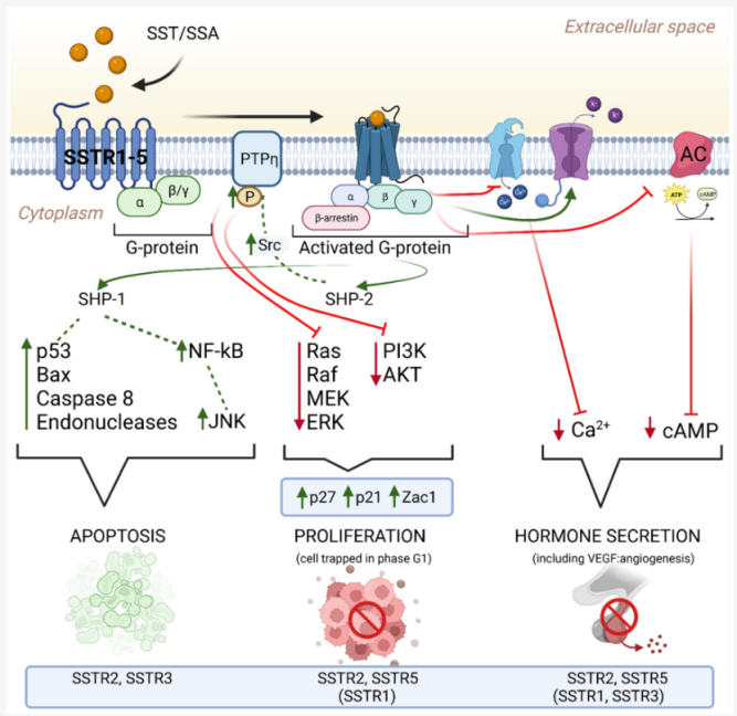 SSTR2與其它同家族受體一樣,在結合內源性多肽配體SST后可以與Gi蛋白偶聯(lián),通過調節(jié)腺苷酸環(huán)化酶活性進而抑制環(huán)腺苷酸的合成,將外源信號傳遞至胞內,從而參與調節(jié)多種激素的分泌,抑制細胞生長增殖。SSTR還能激活K+ 通道,促進細胞膜超極化,抑制門控Ca2+通道的激活,進而阻礙Ca2+內流,抑制胞吐,抑制荷爾蒙的分泌功能。當SSTR2或其它亞型與SST結合后,可以通過蛋白酪氨酸磷酸途徑,SSTR導致蛋白酪氨酸磷酸酶(PTP)上調,使酪氨酸激酶去磷酸化而失活,并抑制促絲裂原活化蛋白激酶(MAPK)等多種蛋白激酶,抑制癌基因、c-fos、c-mys、c-jun等轉錄激活,從而抑制DNA和蛋白質的合成。
