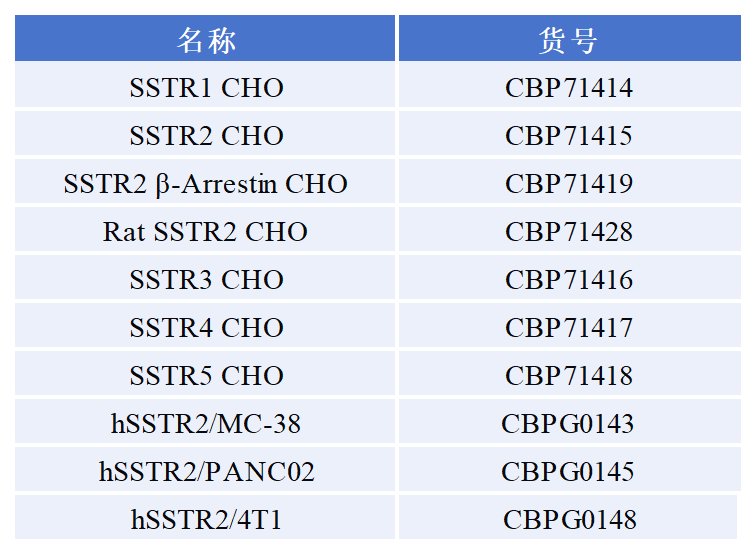 生長抑素受體(Somatostatin receptor,SSTRs)是 GPCR 超家族中的Class A家族的成員,共有 5 種亞型,分別為SSTR1-SSTR5,其中SSTR2是唯一一種有SSTR2a和SSTR2b這2種異構體的SSTR亞型受體蛋白。SSTR2廣泛分布于正常組織中,如腦下垂體、胰島、腎上腺、胸腺、胃腸道以及免疫系統(tǒng)等,在不同受體的組織,表達譜各不相同。SSTR2 在神經母細胞瘤、垂體腺瘤、黑色素瘤、甲狀腺癌以及許多神經內分泌腫瘤中高表達。