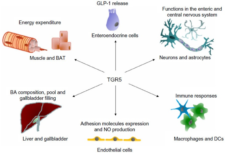 TGR5在多種細胞類型中被研究,如肌肉細胞、脂肪細胞、內(nèi)皮細胞(ECs)和巨噬細胞。TGR5的功能依賴于細胞類型,從胰高血糖素樣肽-1 (GLP-1)的釋放和線粒體能量穩(wěn)態(tài)到炎癥反應(yīng)的控制。