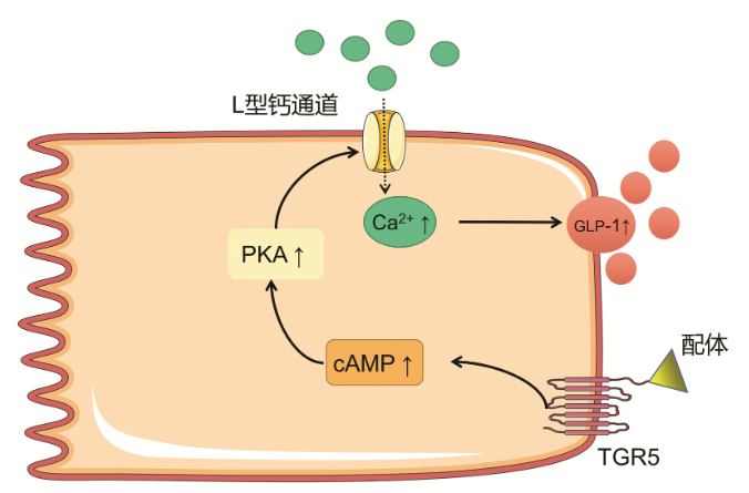 TGR5在維持葡萄糖穩(wěn)態(tài)和胰島素敏感性方面上的效果已得到廣泛證明。例如,使用TGR5激動劑6α-乙基-23(S)-甲基-膽酸(6α-ethyl-23(S)-methyl-cholic acid,INT-777)可以提高肥胖小鼠的胰島素敏感性,7-硫酸膽酸以TGR5依賴性方式增加胰島素抵抗小鼠的葡萄糖耐量等。機體各組織的TGR5可通過不同的分子機制參與血糖代謝的調(diào)節(jié)。TGR5對于血糖代謝的作用,主要與腸促胰島素釋放相關(guān),通過刺激腸內(nèi)分泌L細胞分泌GLP-1來實現(xiàn)。既往研究發(fā)現(xiàn),GLP-1可促進胰島素分泌,促進胰島β細胞存活和增殖,抑制細胞凋亡,并且可有效刺激2型糖尿病患者的胰島素分泌并降低血糖。早期觀點認為TGR5被激活后刺激腸內(nèi)分泌L細胞內(nèi)cAMP水平增加,線粒體氧化磷酸化增加,ATP/ADP比例增加,導致ATP依賴性鉀離子通道(KATP)關(guān)閉,開放鈣離子通道,促進鈣離子內(nèi)流,釋放GLP-1。但后續(xù)大量研究驗證了GLP-1的分泌確實與cAMP升高,胞內(nèi)鈣離子升高有關(guān),但與ATP依賴性鉀離子通道無關(guān)。Brighton等的實驗進一步驗證了GLP-1分泌與L細胞內(nèi)的cAMP和Ca2+濃度變化有關(guān),并且說明了該作用主要由位于基底外側(cè)L細胞膜上的TGR5介導。近年來,Goldspink等發(fā)現(xiàn)腸L細胞上的TGR5被激活后,通過cAMP/PKA途徑,開放了L型Ca2+通道,促進Ca2+內(nèi)流,引發(fā)GLP-1分泌。