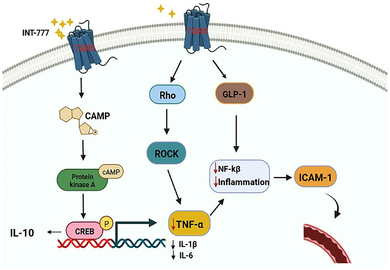 有報道稱,在慢性炎癥反應(yīng)中,TNF-α可激活多種半胱天冬酶,導致炎癥細胞凋亡。TGR5已被發(fā)現(xiàn)通過調(diào)節(jié)Rho/Rho相關(guān)蛋白激酶(ROCK)信號通路來調(diào)節(jié)TNF-α。作為TGR5的激動劑,INT-777可以阻斷TNF-α誘導的RMEC增殖和遷移,抑制TNF-α促進血管通透性的作用。此外,已有證據(jù)表明,TGR5激動劑可以通過激活TGR5- camp蛋白激酶A (PKA)信號通路,上調(diào)IL-10的表達,發(fā)揮抗炎和免疫抑制作用,降低促炎細胞因子IL-1β、IL-6和TNF-α的表達。有研究表明,GLP-1可通過抑制NF-κB延緩ECs的損傷,進而抑制IL-1β、IL-6、TNF-α等炎癥因子的分泌。而各種研究證實GLP-1是TGR5的靶點之一;其分泌依賴于TGR5。因此,推測激活TGR5可能是刺激GLP-1分泌、延緩RMEC損傷的有效途徑。