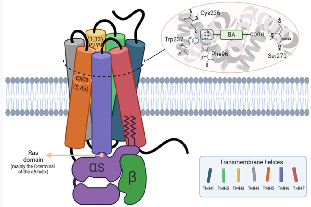 TGR5 受體是第一個已知的膽汁酸特異性G蛋白偶聯(lián)受體,也被稱為膽汁酸受體 1(GPBAR1),屬于 A 類 G 蛋白偶聯(lián)受體(GPCR)亞家族。該受體由七個跨膜螺旋(TMH1-7)、三個胞外環(huán)(ECL1-3)組成,有助于配體結(jié)合,以及三個胞內(nèi)環(huán)(ICL1-3),參與將信號傳遞給下游信號分子。