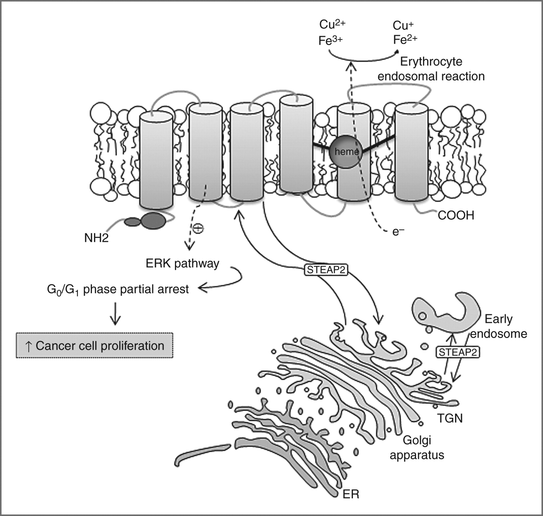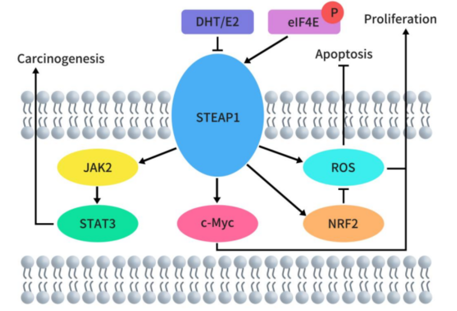 STEAP2,又被稱為前列腺六跨膜蛋白 1(STAMP1),是一種由 490 個氨基酸組成的(56.1 kDa)蛋白質(zhì),其在高爾基體復(fù)合體、跨高爾基體網(wǎng)絡(luò)以及質(zhì)膜中高度表達(dá)。這表明 STEAP2 參與了某些內(nèi)吞和外排運(yùn)輸途徑。STEAP2 有助于紅細(xì)胞中 Fe3+ 和 Cu2+ 的正常攝取,并將其還原為 Fe2+ 和 Cu+,從而促進(jìn)轉(zhuǎn)鐵蛋白循環(huán)的進(jìn)行。通過激活 ERK 通路,STEAP2 誘導(dǎo)癌細(xì)胞在 G0-G1 細(xì)胞周期階段的部分停滯,從而增加細(xì)胞增殖和腫瘤發(fā)展。
