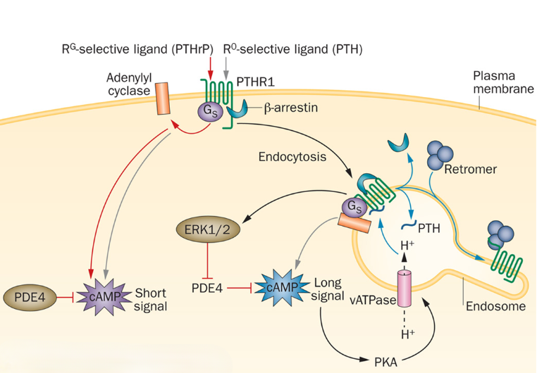 PTH1R的核心結(jié)構(gòu)包括N端胞外結(jié)構(gòu)域(ECD)、7次跨膜結(jié)構(gòu)域(7TMD,由七個跨膜α螺旋和連接環(huán)組成)和C端胞內(nèi)結(jié)構(gòu)域。PTH 或 PTHrP 的氨基末端肽與PTH1R的ECD結(jié)合后,會導致 G 蛋白的激活,主要是 Gα,它激活腺苷酸環(huán)化酶,并以磷酸二酯酶限制的方式催化 cAMP 的產(chǎn)生。當達到足夠的局部細胞內(nèi)濃度時,cAMP 激活 PKA,PKA 易位到細胞核,在核內(nèi)磷酸化 CREB,從而能夠在特定基因上轉(zhuǎn)錄 cAMP 響應元件,從而調(diào)控成骨細胞分化和鈣磷代謝。PTH1R 信號傳導可以發(fā)生在細胞表面,或者對于 PTH 氨基末端肽,它也可以發(fā)生在配體和受體內(nèi)化后。
