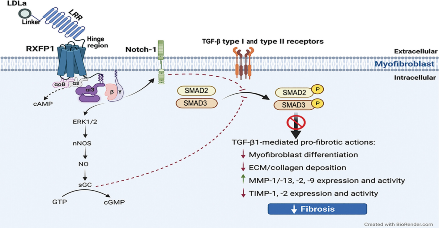 RXFP1 是一種 C 型 LGR 相關(guān) GPCR,含有由多個(gè)細(xì)胞外基序組成的約 400 個(gè)氨基酸的大細(xì)胞外區(qū)域,包括富含亮氨酸的重復(fù)結(jié)構(gòu)域(LRR)和低密度脂蛋白 A 類 (LDLa) 模塊,它們通過連接子區(qū)域連接。RXFP1在其 LRR 相關(guān)胞外結(jié)構(gòu)域內(nèi)激活,引發(fā)受體的構(gòu)象變化,然后允許其 7TM 結(jié)構(gòu)域的細(xì)胞外環(huán)內(nèi)低親和力結(jié)合位點(diǎn)的相互作用和激活,這由其連接子區(qū)域促進(jìn)。受體的連接子區(qū)域在配體結(jié)合時(shí)穩(wěn)定受體構(gòu)象方面起著關(guān)鍵作用,并將殘基定位在連接子區(qū)域和 LDLa 模塊內(nèi)以與 7TM 結(jié)構(gòu)域結(jié)合并激活受體。然后,該作用使 LDLa 模塊能夠充當(dāng)系留激動劑,并在配體結(jié)合時(shí)引導(dǎo)受體信號傳導(dǎo)。位于 RXFP1 C 末端的鉸鏈區(qū)域在受體激活時(shí)也會發(fā)生構(gòu)象和增加暴露,以誘導(dǎo) G 蛋白 (Gαs, GαOB, Gαi3和 Gβγ) 活動。在肌成纖維細(xì)胞中,這導(dǎo)致 cAMP 短暫升高,但 pERK1/2 增加更持久,nNOS-NO-sGC-cGMP 活性因 RXFP1-ERK1/2 依賴性增加。RXFP1-pERK1/2-nNOS-NO-sGC-cGMP 依賴性途徑的激活或肌成纖維細(xì)胞直接激活 cGMP 然后抑制 SMAD2 和 SMAD3 水平的 TGF-β1 信號轉(zhuǎn)導(dǎo),從而抑制 TGF-β1 促進(jìn)肌成纖維細(xì)胞分化和肌成纖維細(xì)胞誘導(dǎo)的 ECM/膠原蛋白合成和沉積的能力。RXFP1 激活還可以調(diào)節(jié) Notch-1 依賴性信號傳導(dǎo),以抑制肌成纖維細(xì)胞中的 TGF-β1/SMAD3 軸。此外,RXFP1-pERK1/2-nNOS-NO-sGC-cGMP依賴性途徑的激活導(dǎo)致ECM降解MMP的表達(dá)和活性增加(當(dāng)TGF-β1活性上調(diào)時(shí)通常受到抑制),以及TIMP的活性降低,這將促進(jìn)MMP誘導(dǎo)的已建立ECM/膠原沉積的分解,并有助于減少纖維化進(jìn)展。