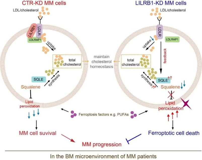 另有文獻(xiàn)揭示在多發(fā)性骨髓瘤(MM:multiple myeloma)細(xì)胞中,膜蛋白LILRB1通過(guò)協(xié)助MM細(xì)胞攝取低密度脂蛋白(LDL),維持細(xì)胞內(nèi)膽固醇合成通路中具有抗氧化作用的代謝物角鯊烯(squalene)的含量,從而保護(hù)MM細(xì)胞不發(fā)生鐵死亡,促進(jìn)多發(fā)性骨髓瘤的惡性進(jìn)展。