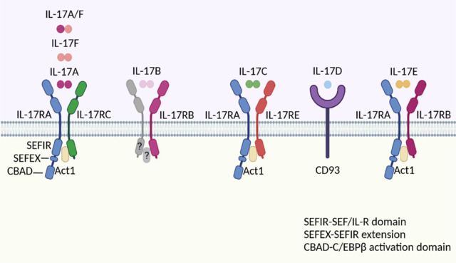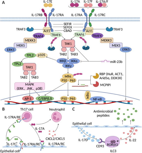 IL-17 細(xì)胞因子具有一個(gè)半胱氨酸環(huán)結(jié)構(gòu),它們會(huì)與特定的 IL-17R 受體結(jié)合,通過(guò) SEFIR、SEFEX 和 CBAD 結(jié)構(gòu)域激活免疫信號(hào)傳導(dǎo)。IL-17 信號(hào)傳導(dǎo)始于 IL-17A/A、IL-17A/F 或 IL-17F/F 細(xì)胞因子與其受體(IL-17RA 和 IL-17RC)的結(jié)合,或者 IL-17E/E 細(xì)胞因子與其受體(IL-17RA 和 IL-17RB)的結(jié)合。當(dāng)配體結(jié)合后,Act1 會(huì)激活多種獨(dú)立的信號(hào)傳導(dǎo)途徑,這些途徑通過(guò)不同的 TRAF 蛋白介導(dǎo)。TRAF6 的激活會(huì)導(dǎo)致 NF-κB、C/EBPβ、C/EBPδ 和 MAPK 信號(hào)通路的觸發(fā)。IL-17R-Act1 復(fù)合物還通過(guò) TRAF4 與 MEKK3 和 MEK5 結(jié)合,從而激活 ERK5。不同類別的抑制劑,如泛素酶(TRAF3)、去泛素酶(A20)、RBP(HuR、ACT1、Aridα 和 DDX3X)、內(nèi)切核糖核酸酶(MCPIP1/Regnase-1)和微小 RNA(miR-23b),通過(guò)各種獨(dú)立的機(jī)制負(fù)向調(diào)節(jié) IL-17 信號(hào)傳導(dǎo)。IL-17C 主要由上皮細(xì)胞表達(dá)。當(dāng) IL-17RA/RE 受體復(fù)合物表達(dá)時(shí),上皮細(xì)胞本身和 TH17 細(xì)胞都是 IL-17C 的作用靶點(diǎn)。除了增加 Th17 細(xì)胞中 IL17A 的表達(dá)外,IL-17C 還通過(guò)間接方式增強(qiáng)吸引中性粒細(xì)胞的趨化因子在上皮細(xì)胞中的表達(dá),最終導(dǎo)致強(qiáng)烈的炎癥反應(yīng)。