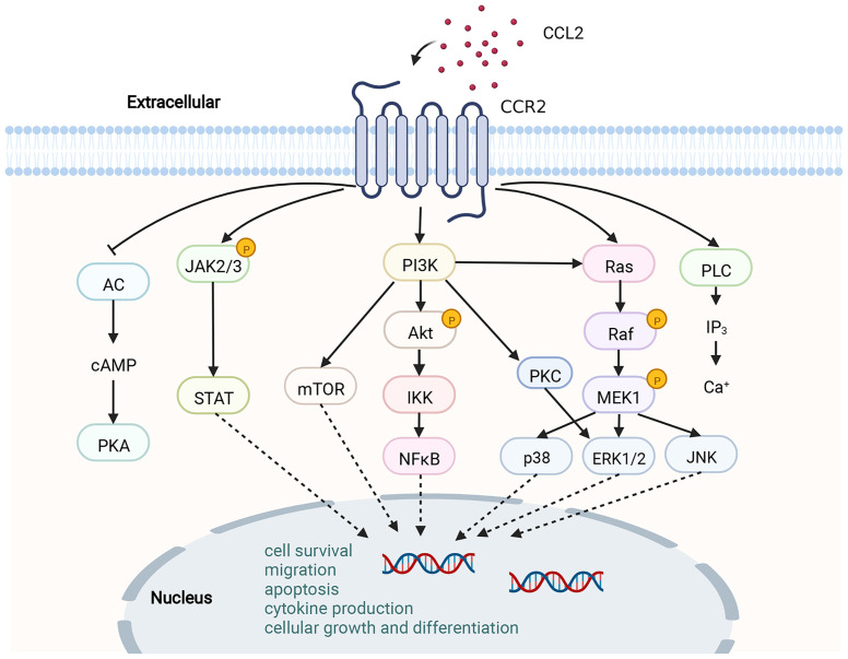 通過結合CCL2,CCR2經歷二聚化和內化,誘導單核細胞趨化蛋白-1誘導蛋白-1(MCPIP1)的表達。隨后,MCP1P1開始轉錄和表達IL-1、CCL2和TNF基因。當CCL2觸發(fā)CCR2時,會啟動多種細胞內G蛋白介導的信號通道,例如JAK/STAT、PI3K/MAPKs和PI3K/Akt/ERK/NF-κB。這些信號通路的激活會激活多種轉錄因子和基因,這些因子參與細胞因子產生、細胞生長與分化、細胞存活、遷移與凋亡、血管生成及炎癥。CCL2-CCR2軸與多種疾病的進展相關,如動脈粥樣硬化、急性肝衰竭、類風濕性關節(jié)炎、肺動脈高壓、糖尿病及并發(fā)癥以及癌癥。因此,CCL2-CCR2軸被認為是此類疾病管理的潛在靶點。
