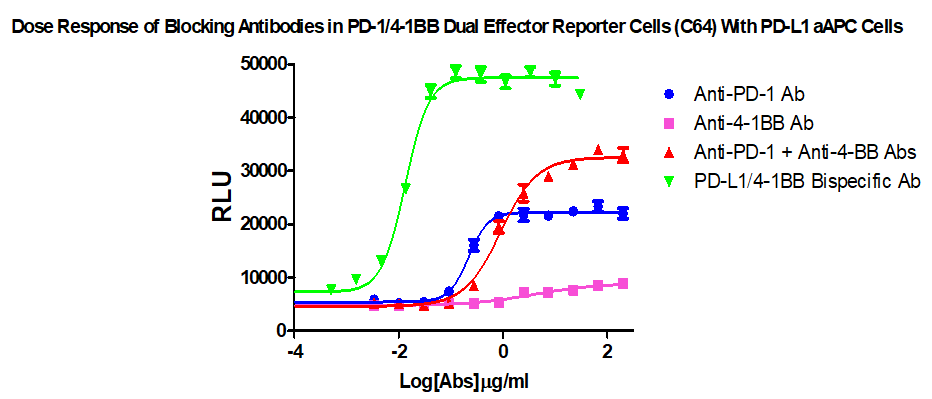 Figure 1. Dose Response of Blocking Antibodies in PD-1/41BB Dual Effector Reporter Cells (C64) With PD-L1 aAPC Cells.
