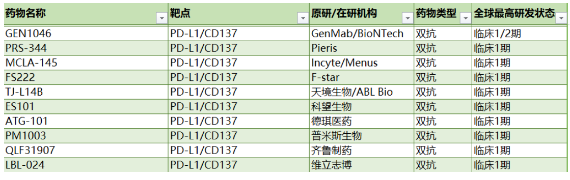 由于4-1BB在高度耗竭的PD-1高表達(dá)CD8+TIL上顯著表達(dá),并且在PD-1阻斷后進(jìn)一步上調(diào),而4-1BB信號傳導(dǎo)則會(huì)誘導(dǎo)CD8+TIL的克隆擴(kuò)增,CD8+TIL表現(xiàn)出腫瘤反應(yīng)性而無終末分化,因此4-1BB和PD-L1可能是誘導(dǎo)T細(xì)胞抗腫瘤反應(yīng)機(jī)制上的一對好搭檔。針對這兩者開發(fā)雙特異性抗體是一種極具前景的開發(fā)策略,引得國內(nèi)外玩家紛紛參與,目前已有十余款針對PD-L1/4-1BB的雙抗藥物處于不同的研發(fā)介段,下表列舉了部分已進(jìn)入臨床的雙抗藥物: