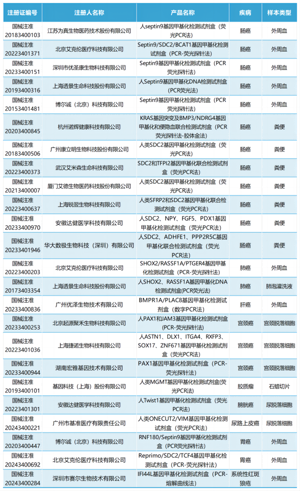 截至目前,已有24款甲基化檢測(cè)相關(guān)試劑盒獲批,具體如下: