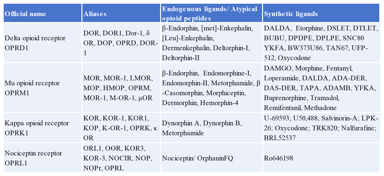 阿片受體(OPR) 屬于A類g蛋白偶聯(lián)受體,可被嗎啡等生物堿類阿片和內(nèi)源性配體如內(nèi)啡肽、腦啡肽等激活。OPR及其配體可見下表。