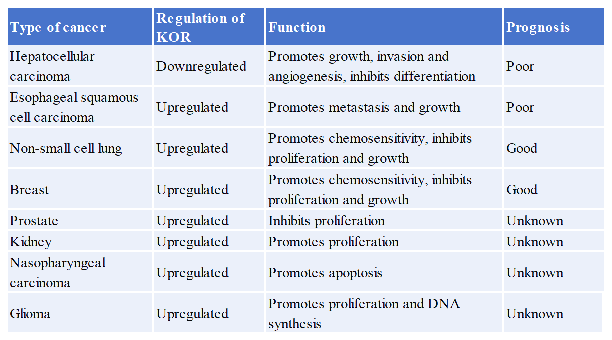 阿片類藥物是最有效的鎮(zhèn)痛藥,已廣泛用作治療疼痛和相關疾病的治療藥物。除了疼痛,阿片類藥物還經(jīng)常用于治療許多其他疾病包括腹瀉、咳嗽、術后疼痛和癌癥。有報道指出KOR可能與幾種癌癥的預后有關,如下圖所示: