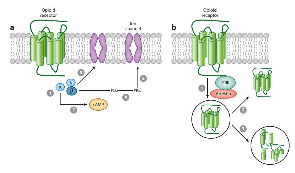 早期阿片受體藥理學研究表明,鳥嘌呤三磷酸鳥苷(GTP)等核苷酸調(diào)節(jié)激動劑與腦組織膜制劑中的阿片受體結合。后來確定GTPase活性由阿片激動劑和內(nèi)源性阿片肽調(diào)節(jié)。激動劑刺激阿片受體抑制環(huán)腺苷一磷酸(AMP)的產(chǎn)生方式與其他類型的g蛋白偶聯(lián)受體(GPCR)相似。阿片受體對cAMP信號的抑制通路屬于Gαi依賴,即阿片受體和激動劑結合時會抑制cAMP的形成。四個阿片受體具有相似的信號通路,每個阿片受體上的選擇性配體結合阿片受體后可引起cAMP形成抑制,MAPK信號通路激活,或者Arrestin招募,蛋白內(nèi)化等。